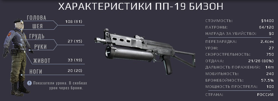 ПП-19 «Бизон» (пистолет-пулемёт 19-й модели) был разработан ИЖМАШ. Производство началось в 1996-м году. В игре, в каждом магазине «Бизона» 64 пистолетных патрона калибра 9-мм Парабеллум, в резерве — 120 патронов. Это оружие распространено у игроков в первых раундах игры.