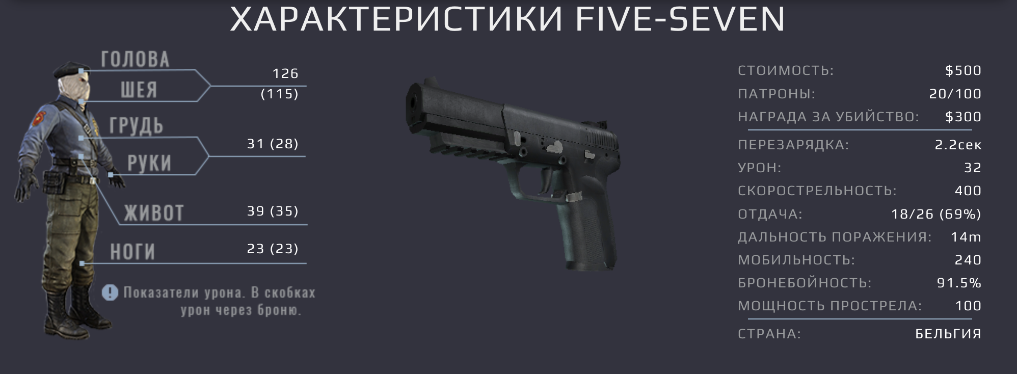 Five-SeveN — полуавтоматический пистолет в Counter-Strike: Global Offensive, который может купить только спецназ. Взаимозаменяем в игровом магазине с CZ75-Auto.