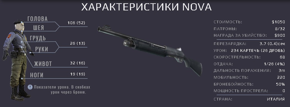 Этот итальянский дробовик имеет в себе 8 патронов 12-ого калибра и 32 патрона в резерве. Nova может быть приобретена как и спецназом, так и террористами. Темп стрельбы Новы чуть ниже, чем у M3, что компенсируется большим уроном.