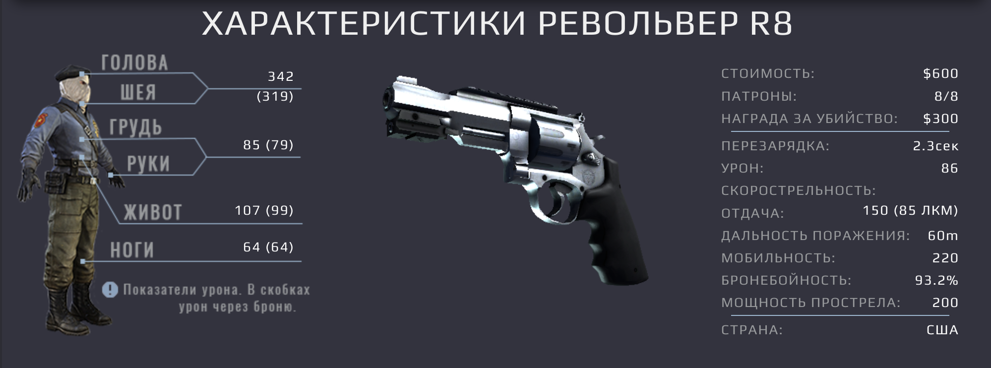 R8 — мощный самовзводный револьвер, доступный для покупки обеим командам. Имеет 8 патронов калибра .357 Magnum в барабане и 8 патронов в запасе.